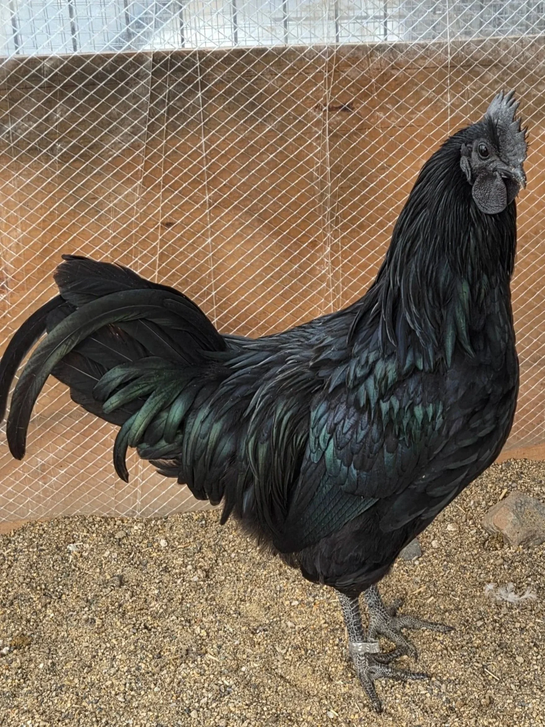 Ayam Cemani: Adds dark skin/comb traits and a unique look.